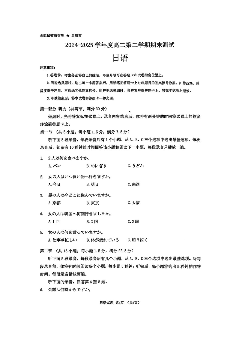 高二日语+答案--山东省临沂市2024-2025学年高二下学期期末素养水平检测考试