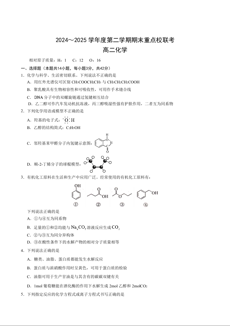 高二化学+答案--天津市五区县重点校2024-2025学年高二下学期7月期末联考试题