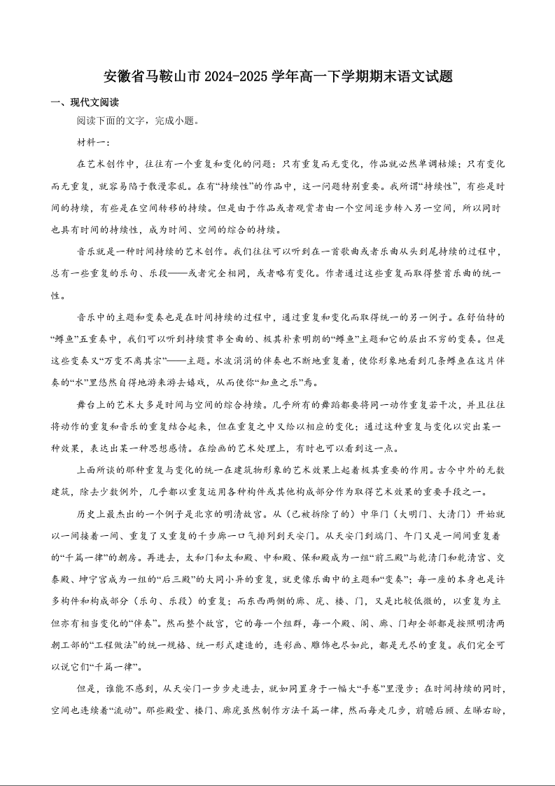 高二语文+答案--安徽省马鞍山市2024-2025学年高一下学期期末考试