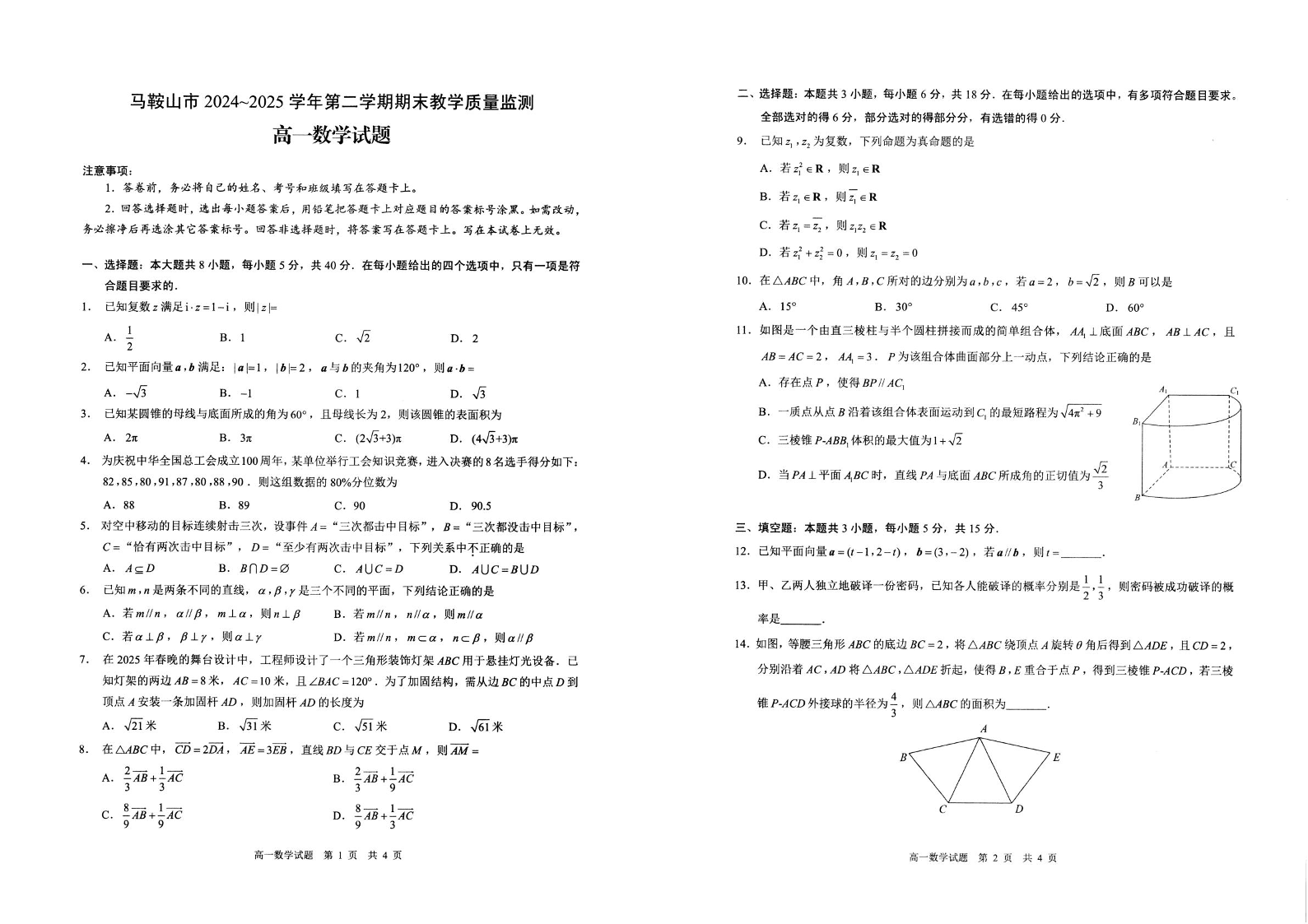 高一数学--安徽省马鞍山市2024-2025学年高一下学期期末考试