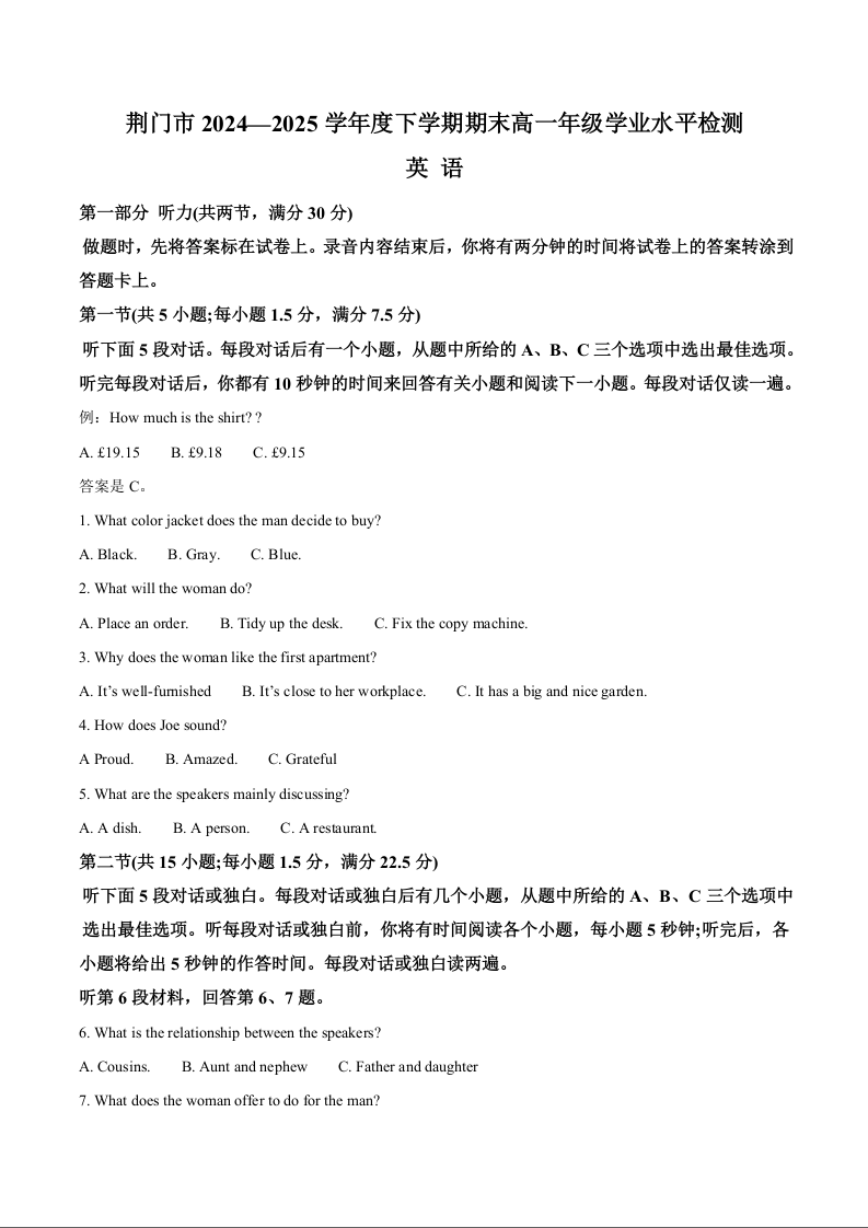 高一英语+答案--湖北省荆门市2024-2025学年高一下学期期末考试
