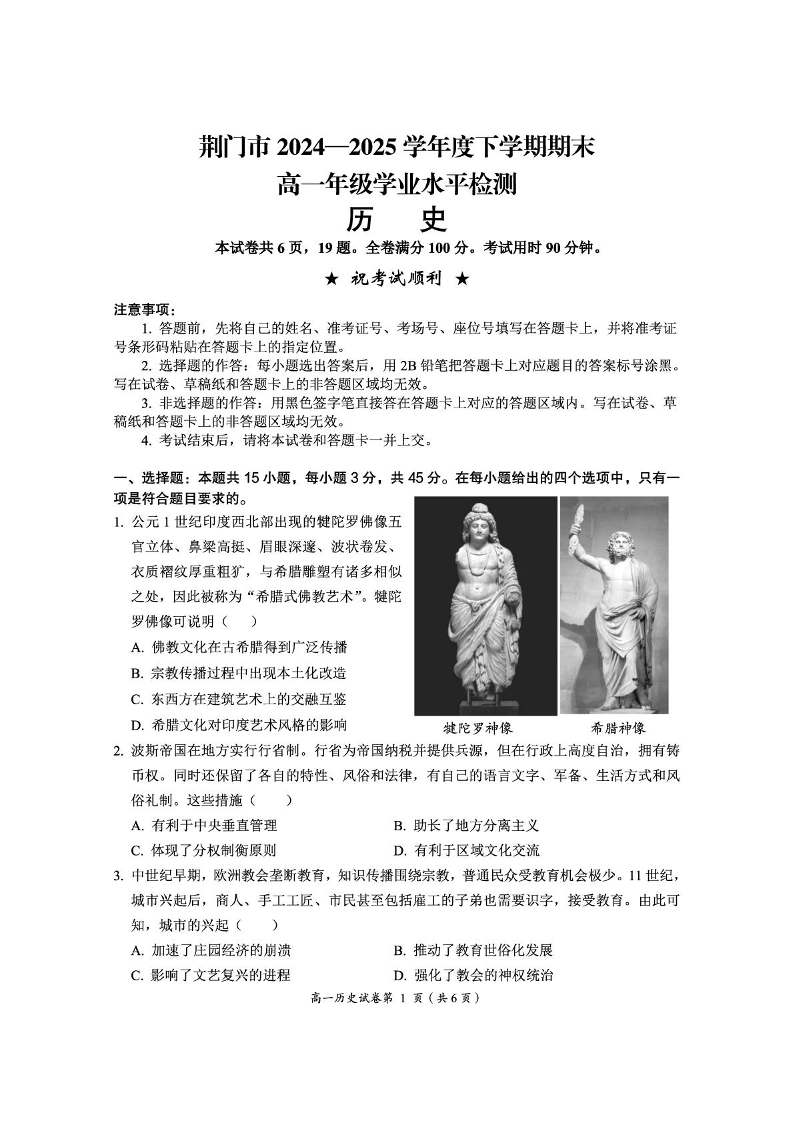 高一历史+答案--湖北省荆门市2024-2025学年高一下学期期末考试