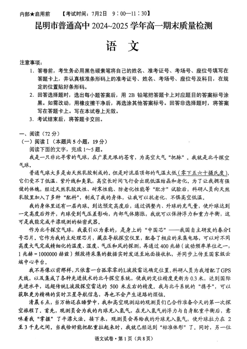 高一语文+答案--云南省昆明市2024-2025学年高一下学期期末考试