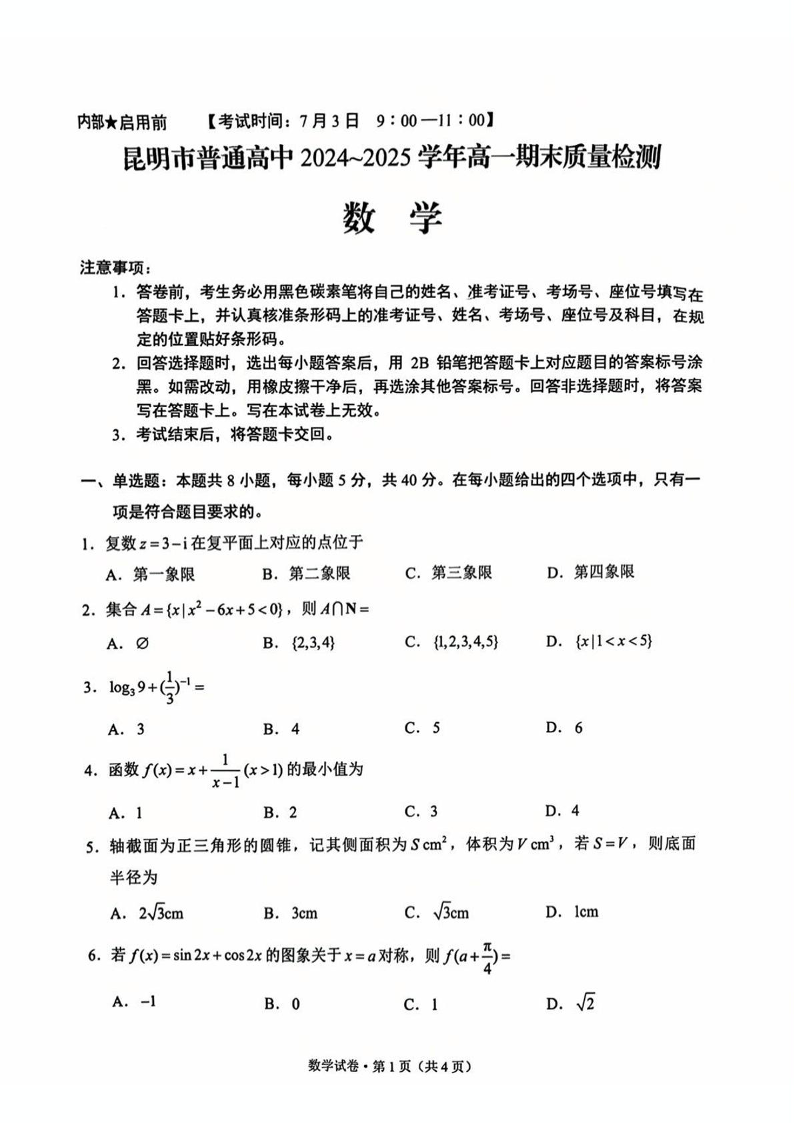高一数学+答案--云南省昆明市2024-2025学年高一下学期期末考试