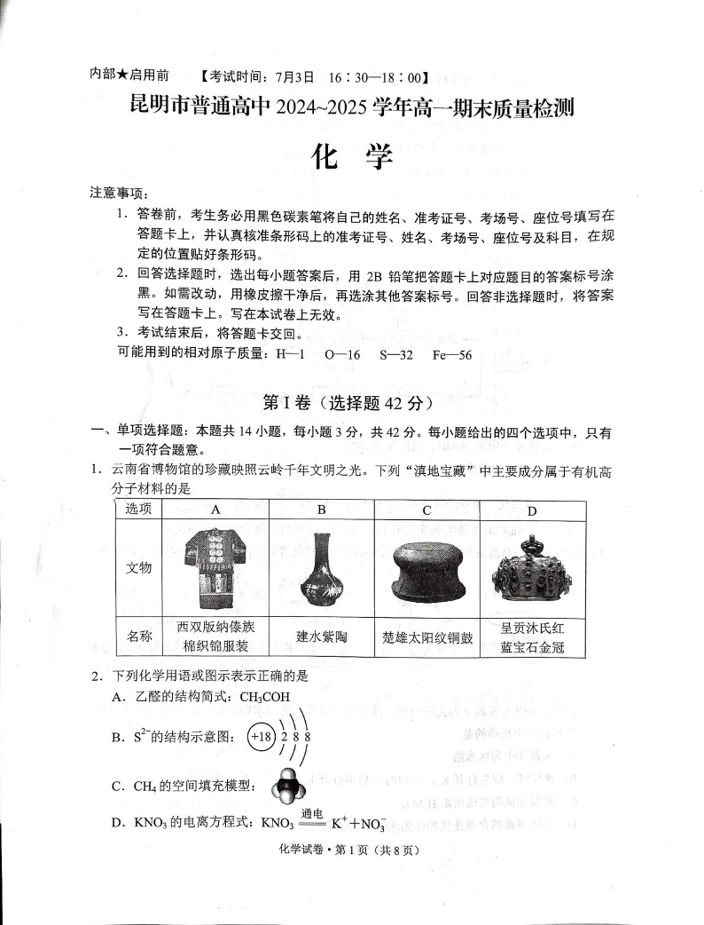 高一化学+答案--云南省昆明市2024-2025学年高一下学期期末考试