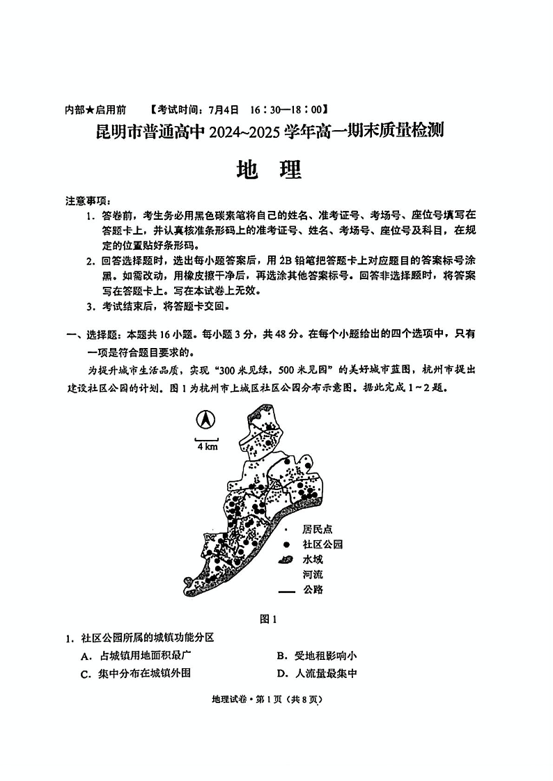 高一地理+答案--云南省昆明市2024-2025学年高一下学期期末考试