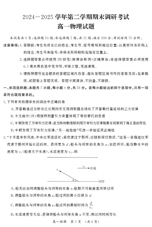 高一物理+答案--河南省开封市2024-2025学年高一下学期期末考试