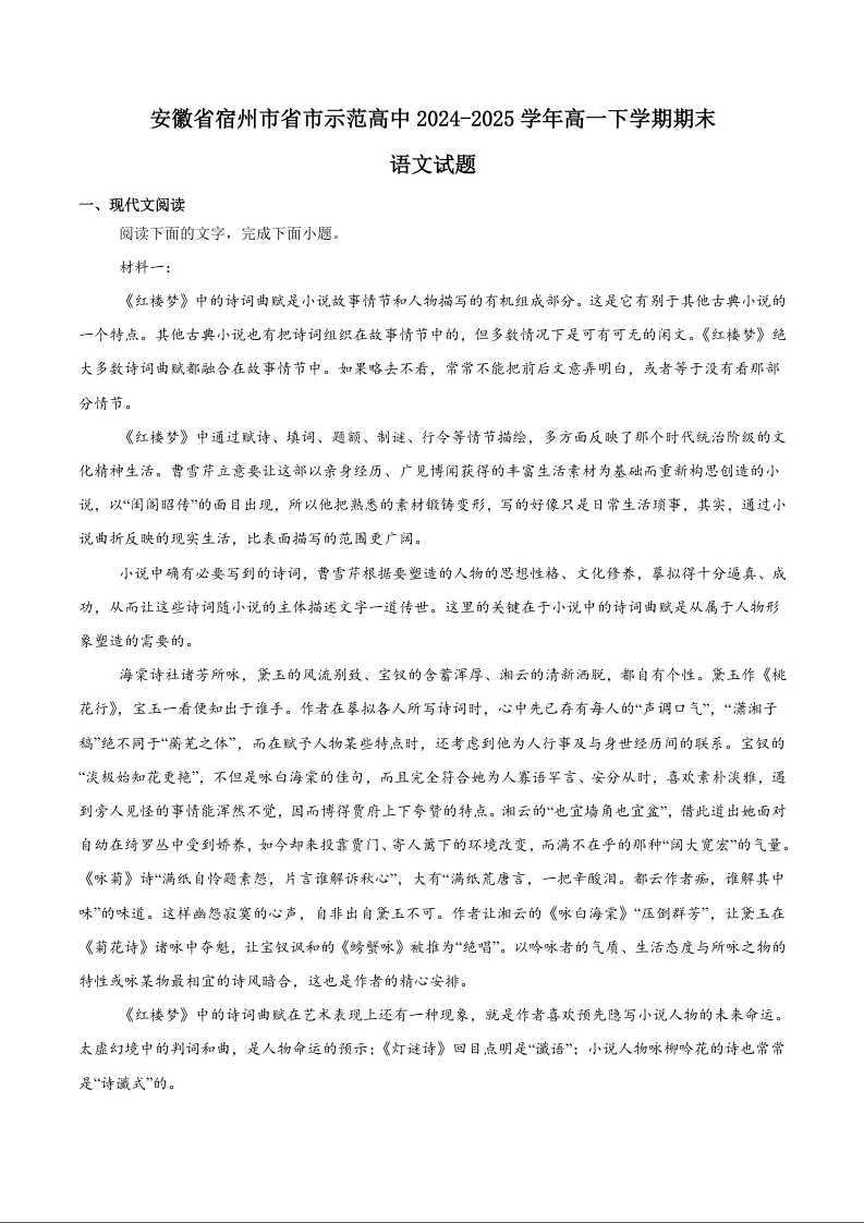 高一语文+答案--安徽省宿州市省、市示范高中2024-2025学年高一下学期期末考试