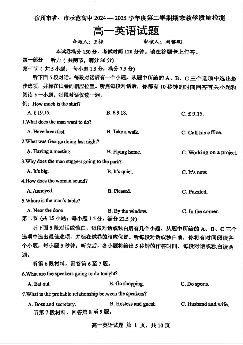 高一英语+答案--安徽省宿州市省、市示范高中2024-2025学年高一下学期期末考试