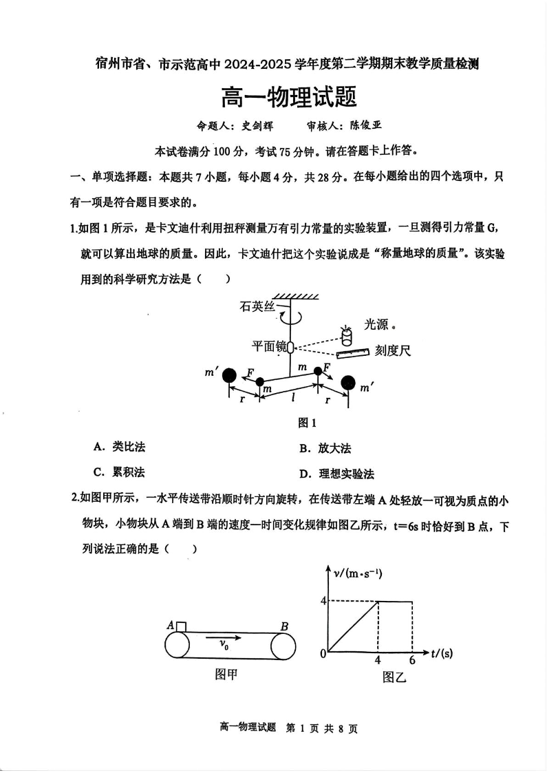 高一物理+答案--安徽省宿州市省、市示范高中2024-2025学年高一下学期期末考试