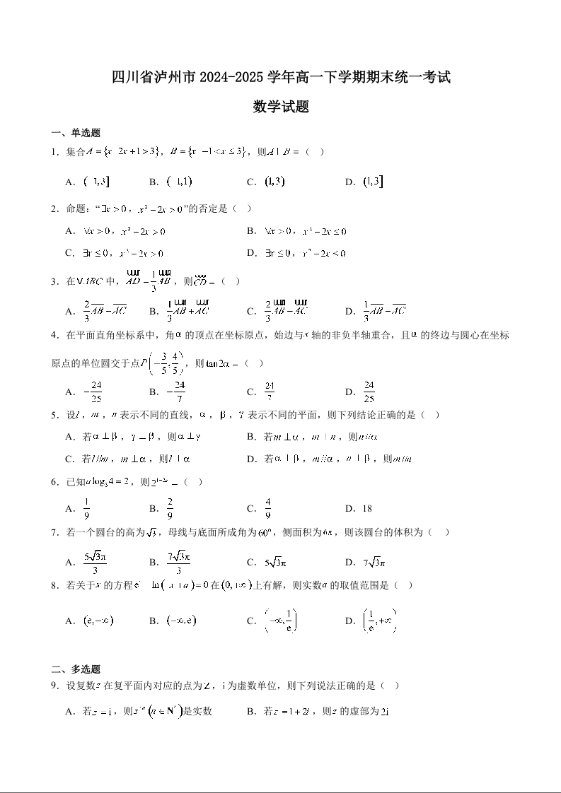 高一数学+答案--四川省泸州市2024-2025学年高一下学期期末统一考试