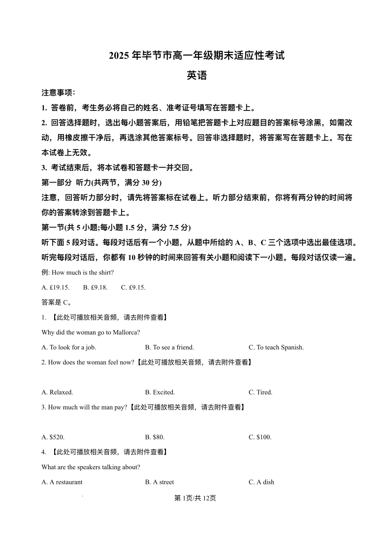 高一英语+答案--贵州省毕节市2024-2025学年高一下学期期末试题