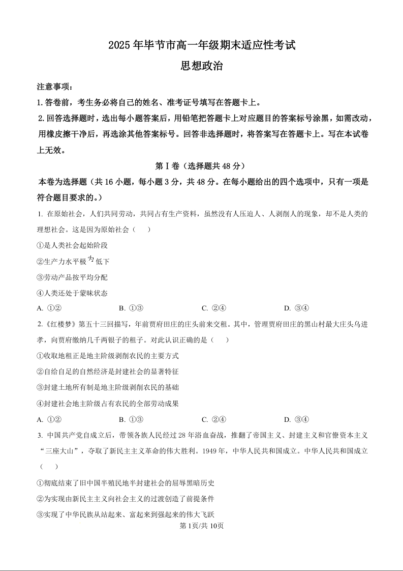 高一政治+答案--贵州省毕节市2024-2025学年高一下学期期末试题