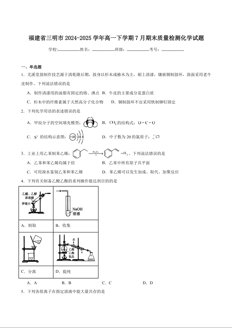 高一化学+答案--福建省三明市普通高中2024-2025学年高一下学期期末考试