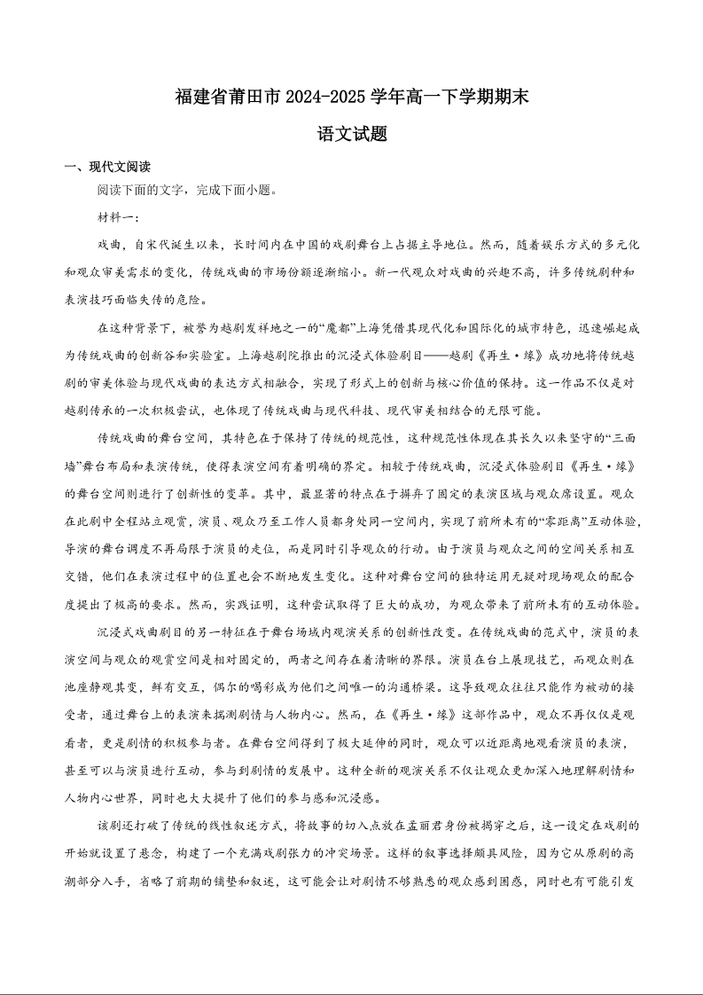 高一语文+答案--福建省莆田市2024-2025学年高一下学期期末考试
