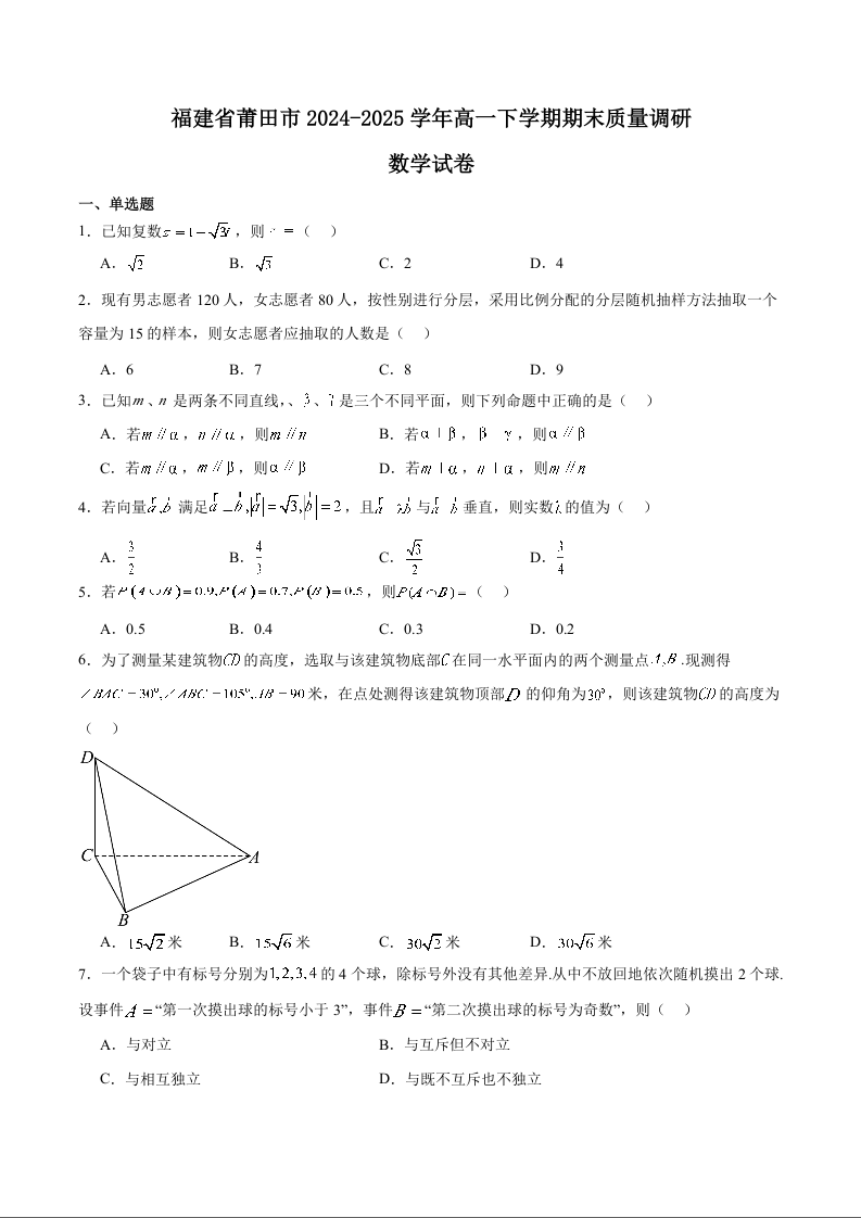 高一数学+答案--福建省莆田市2024-2025学年高一下学期期末考试