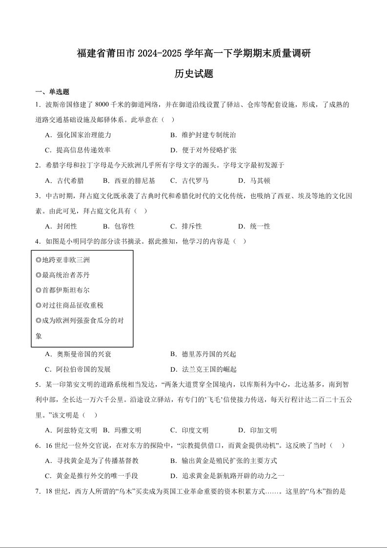 高一历史+答案--福建省莆田市2024-2025学年高一下学期期末考试