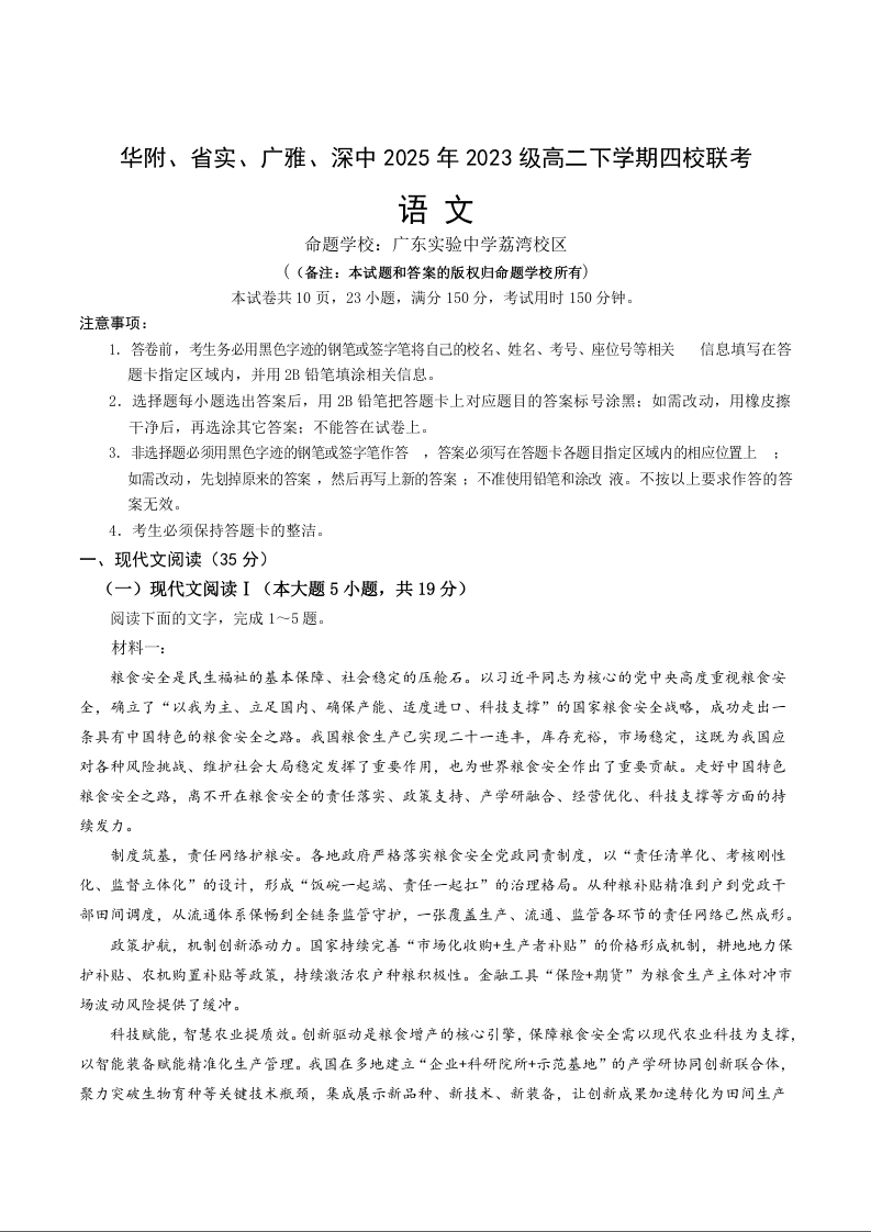 高二语文+答案--广东省华附、省实、广雅、深中四校2024-2025学年高二下学期期末联考