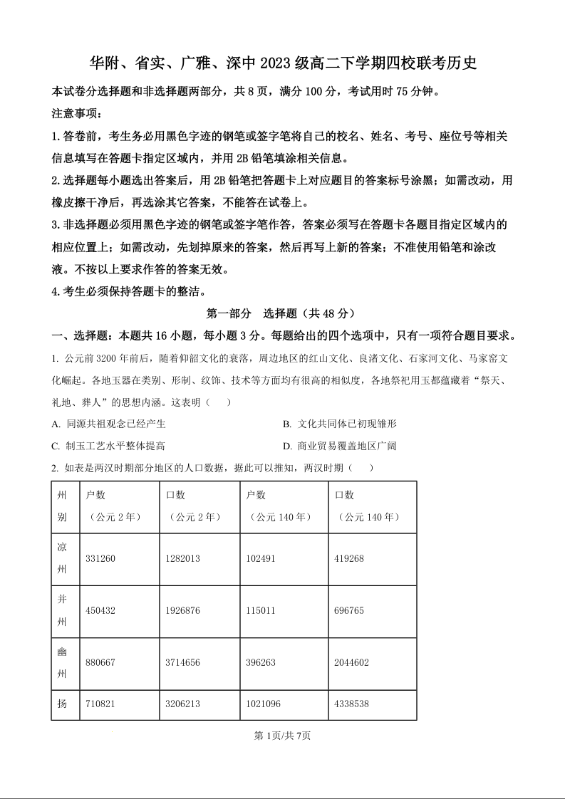 高二历史(原卷版)--广东省华附、省实、广雅、深中四校2024-2025学年高二下学期期末联考