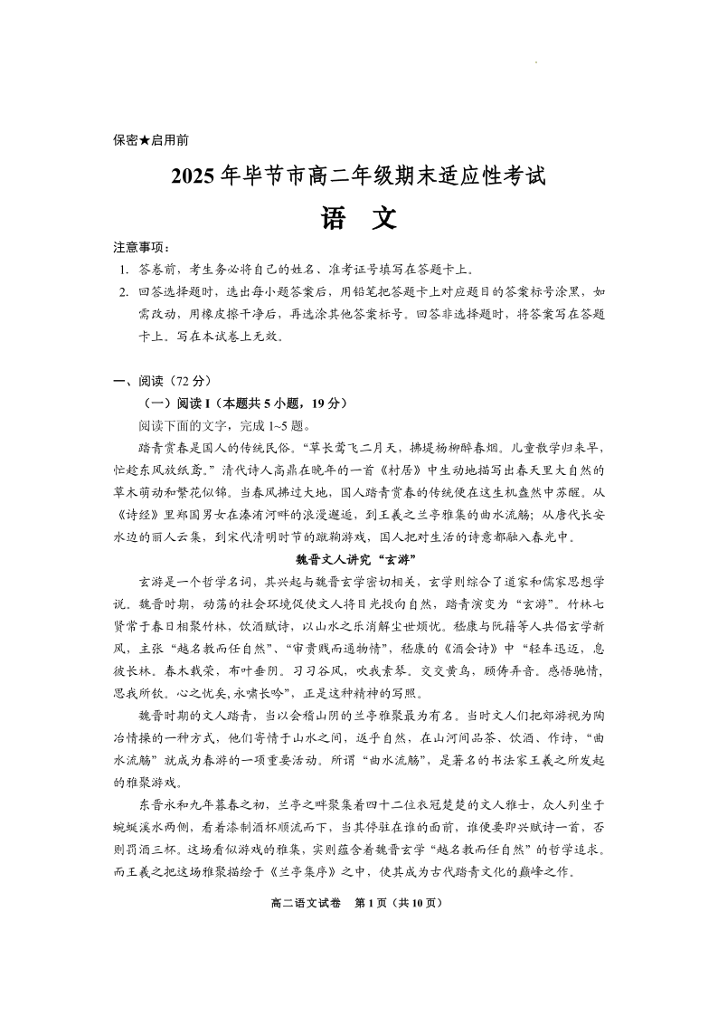 高二语文+答案--贵州省毕节市2024-2025学年高二下学期期末试题