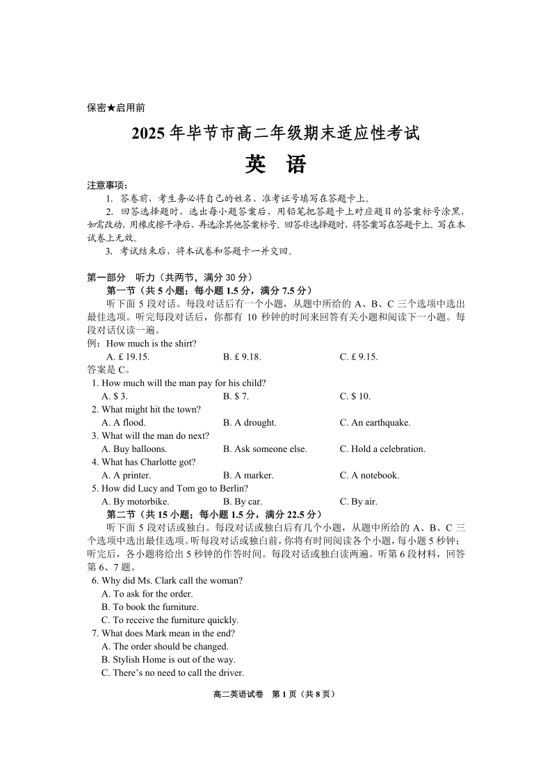 高二英语+答案--贵州省毕节市2024-2025学年高二下学期期末试题
