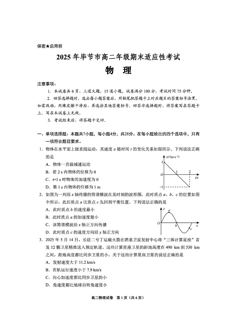 高二物理--贵州省毕节市2024-2025学年高二下学期期末试题