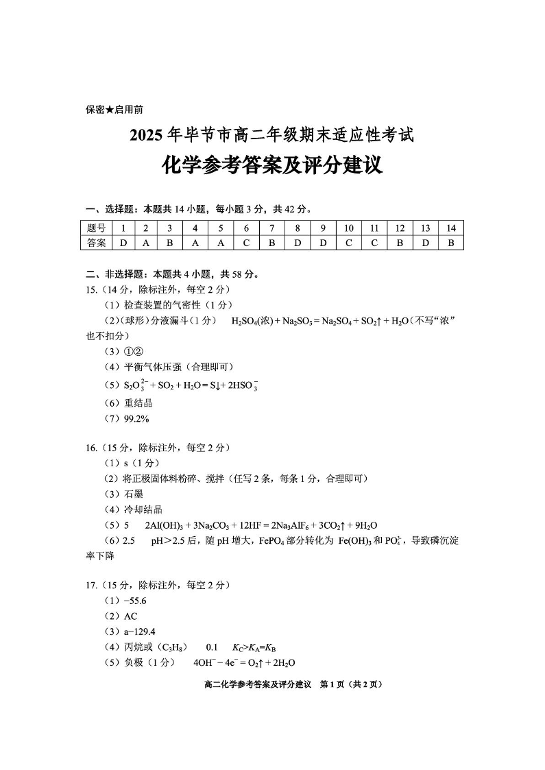 高二化学答案--贵州省毕节市2024-2025学年高二下学期期末试题