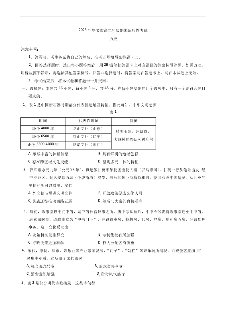 高二历史+答案--贵州省毕节市2024-2025学年高二下学期期末试题