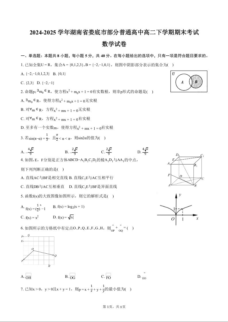 高二数学+答案--湖南省娄底市部分普通高中2024-2025学年高二下学期期末考试
