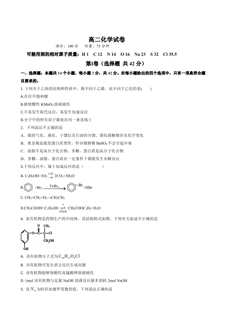 高二化学--湖南省娄底市部分普通高中2024-2025学年高二下学期期末考试
