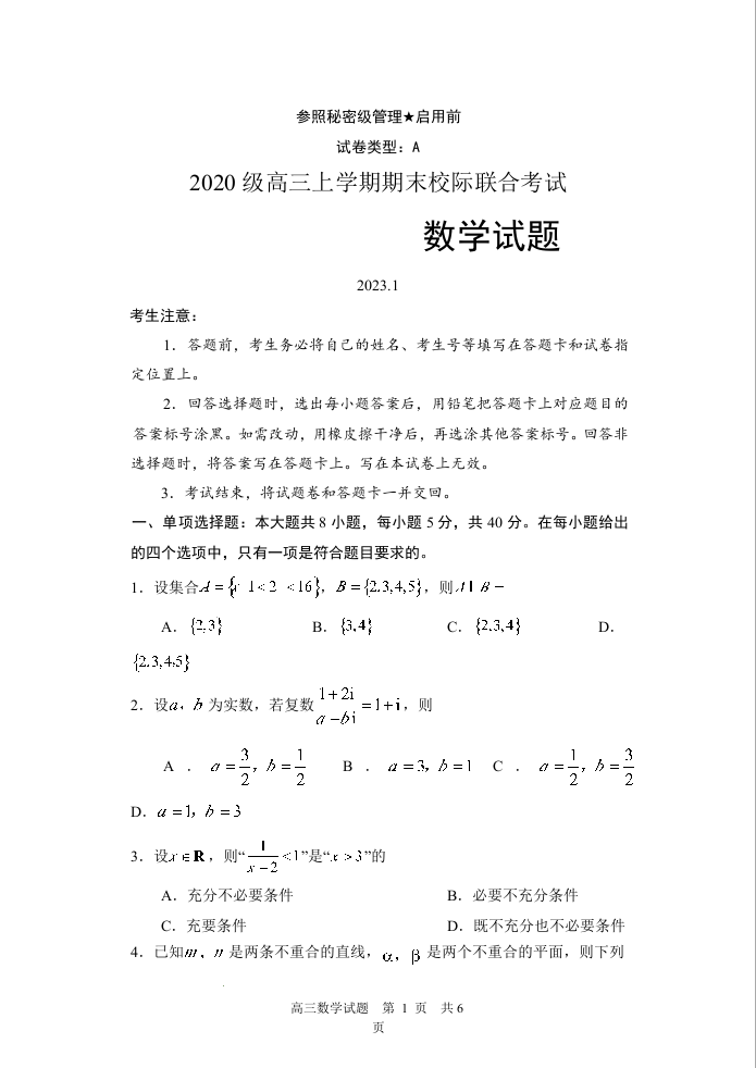 高三数学--山东日照2023届高三上学期期末校际联合考试
