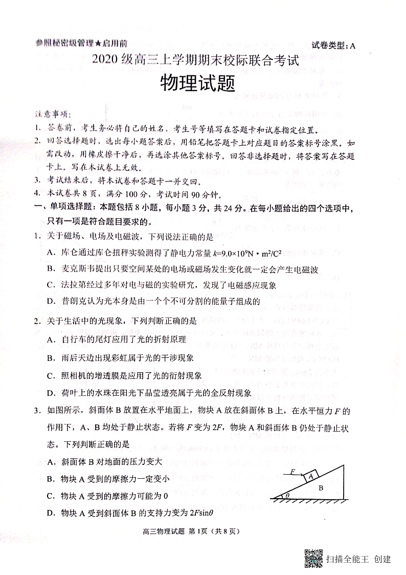 高三物理--山东日照2023届高三上学期期末校际联合考试
