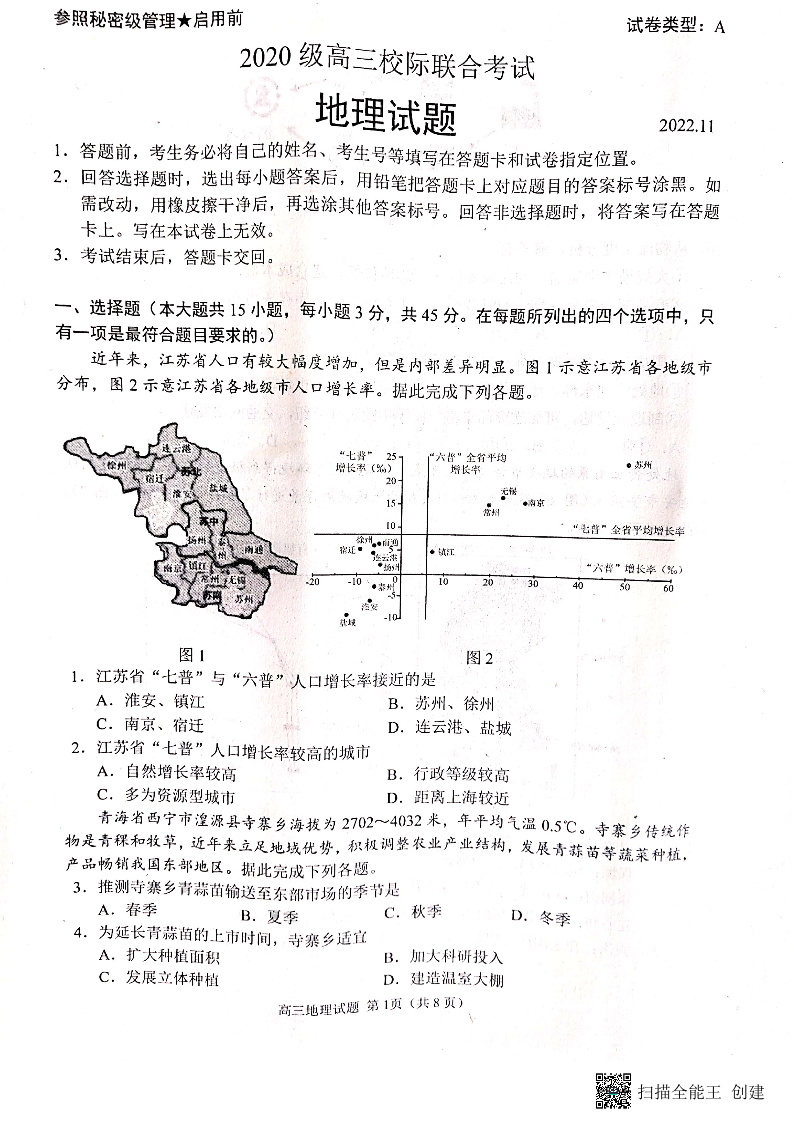 高三地理--山东日照2023届高三上学期期末校际联合考试