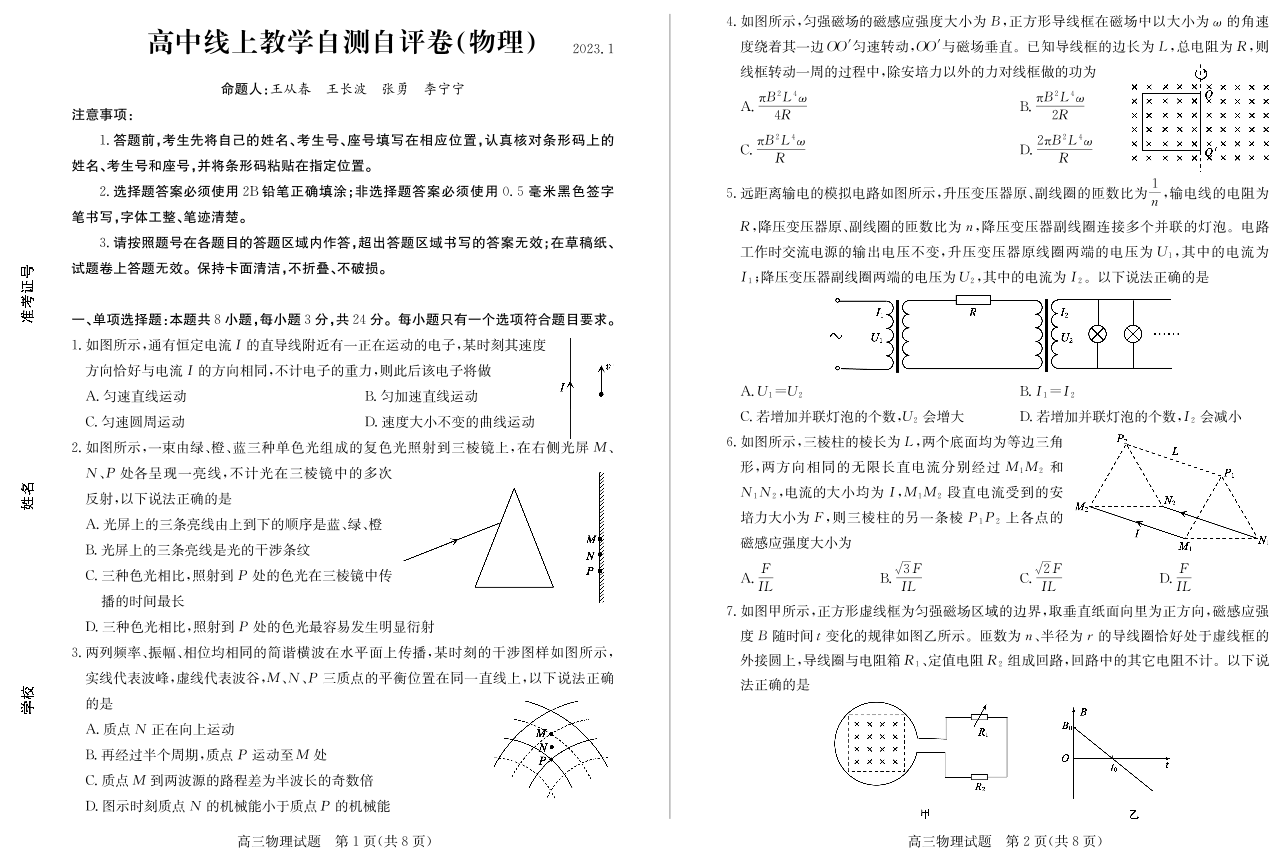 高三物理--山东德州2023届高三线上教学自测自评卷