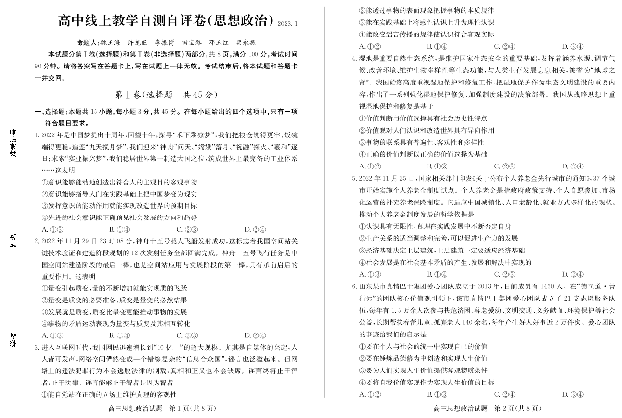 高三政治--山东德州2023届高三线上教学自测自评卷
