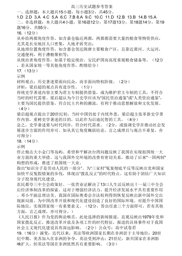 高三历史答案--山东德州2023届高三线上教学自测自评卷