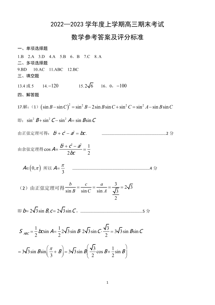 高三数学答案--辽宁省协作校2023高三上学期期末考试