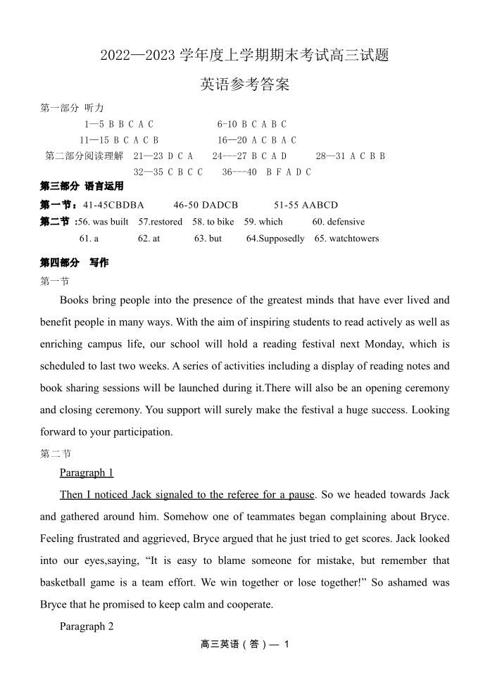 高三英语答案--辽宁省协作校2023高三上学期期末考试