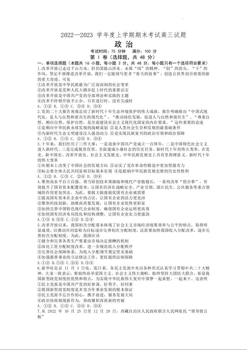 高三政治--辽宁省协作校2023高三上学期期末考试