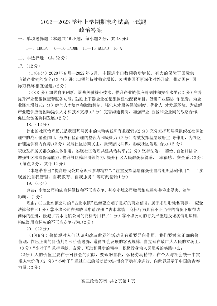 高三政治答案--辽宁省协作校2023高三上学期期末考试