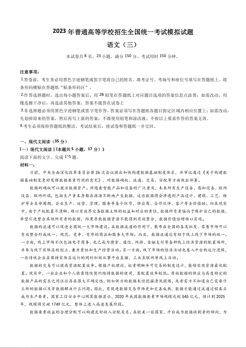 高三语文+答案--辽宁省名校联盟2023届高考模拟调研卷(三)