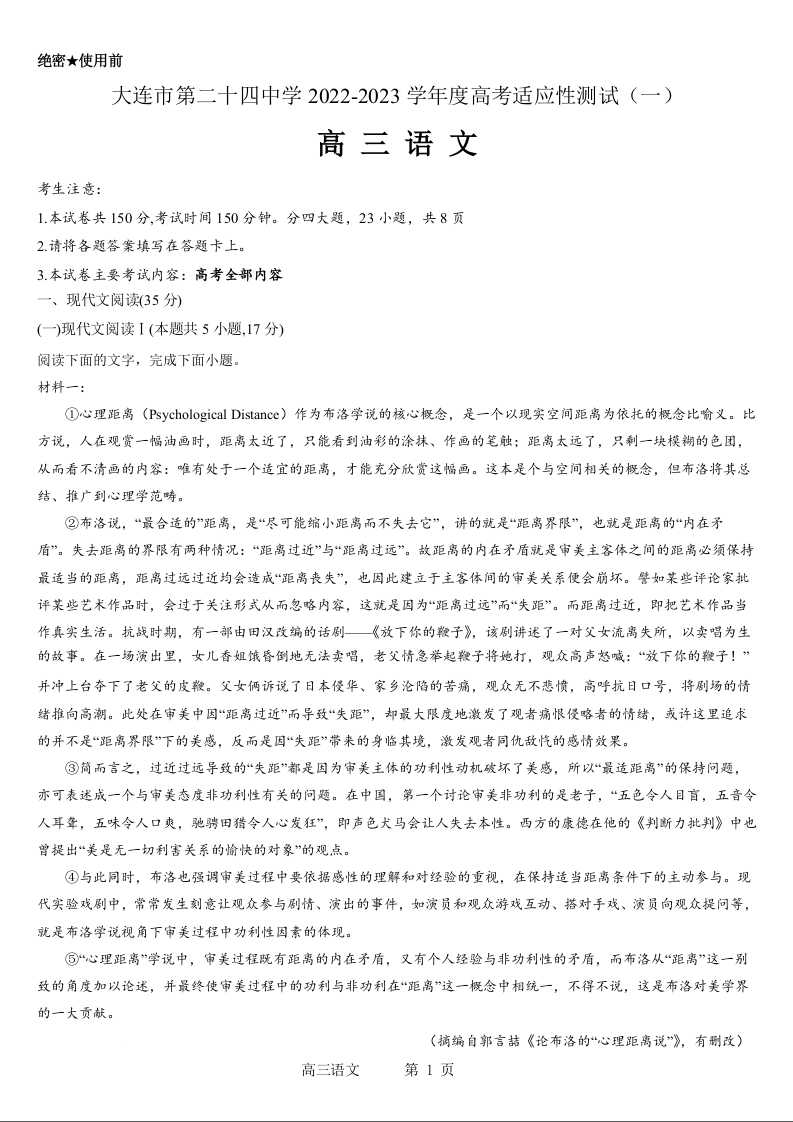 高三语文--辽宁省大连市第二十四中学2023高三上学期高考适应性测试(一模)