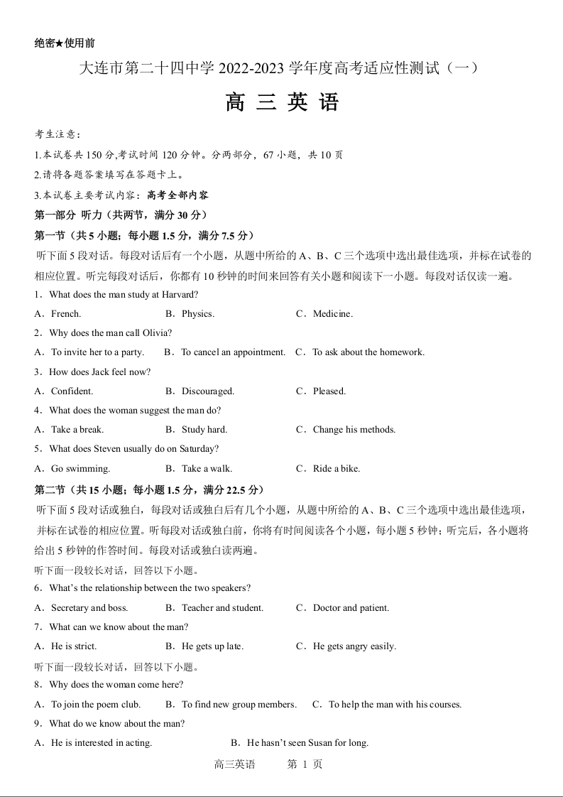 高三英语--辽宁省大连市第二十四中学2023高三上学期高考适应性测试(一模)