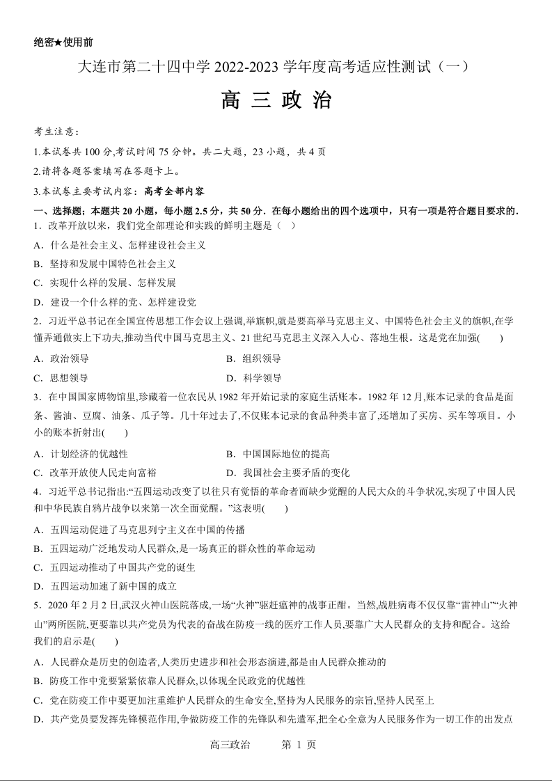 高三政治--辽宁省大连市第二十四中学2023高三上学期高考适应性测试(一模)