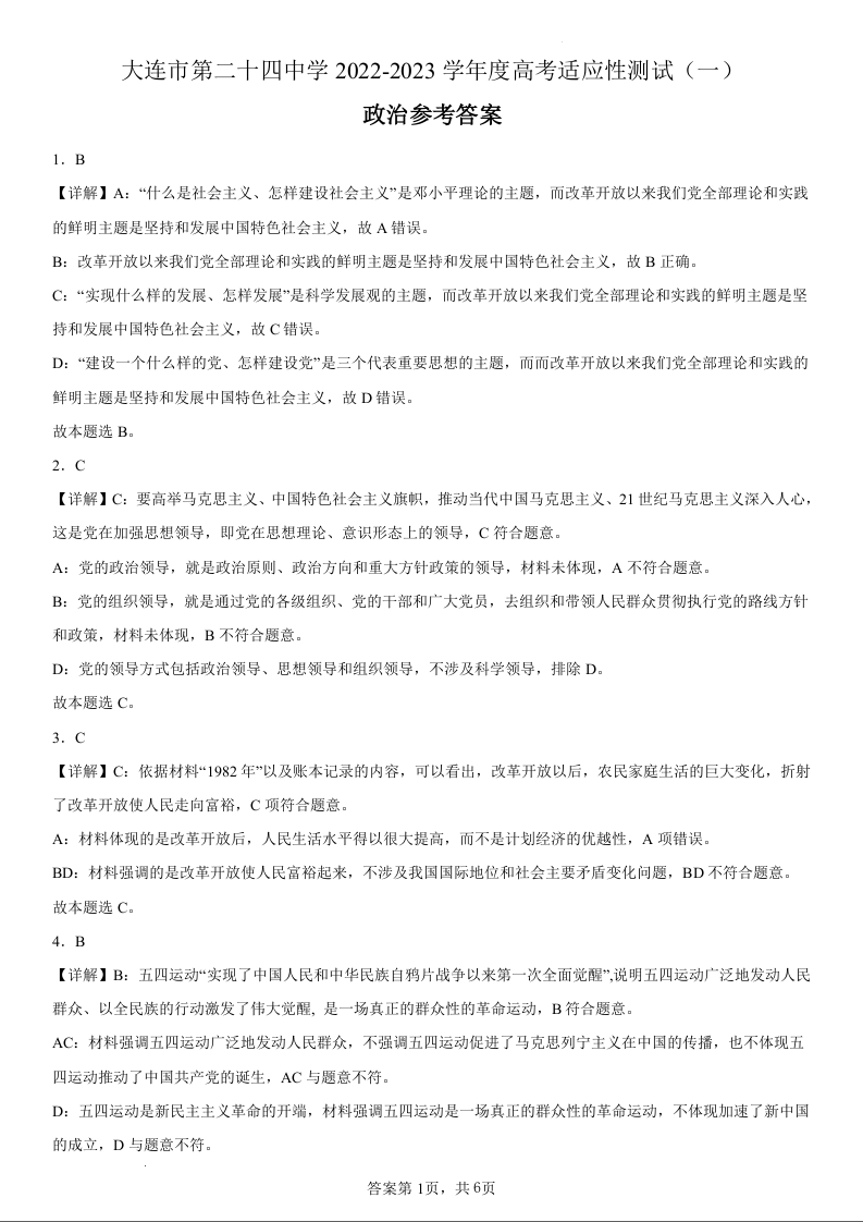 高三政治答案--辽宁省大连市第二十四中学2023高三上学期高考适应性测试(一模)
