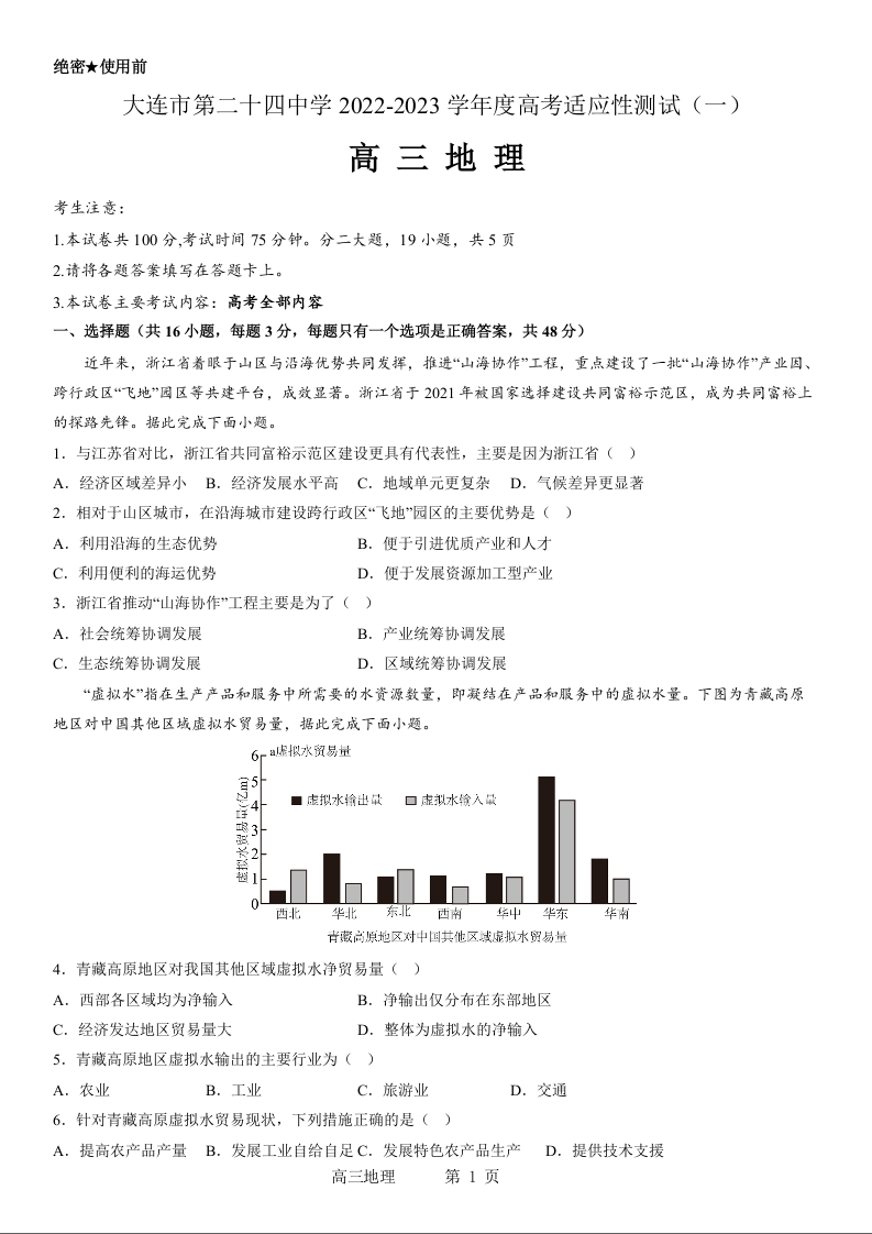 高三地理--辽宁省大连市第二十四中学2023高三上学期高考适应性测试(一模)