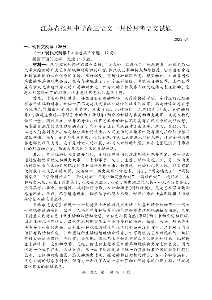 高三语文+答案--江苏省扬州中学2023高三上学期1月月考(期末)