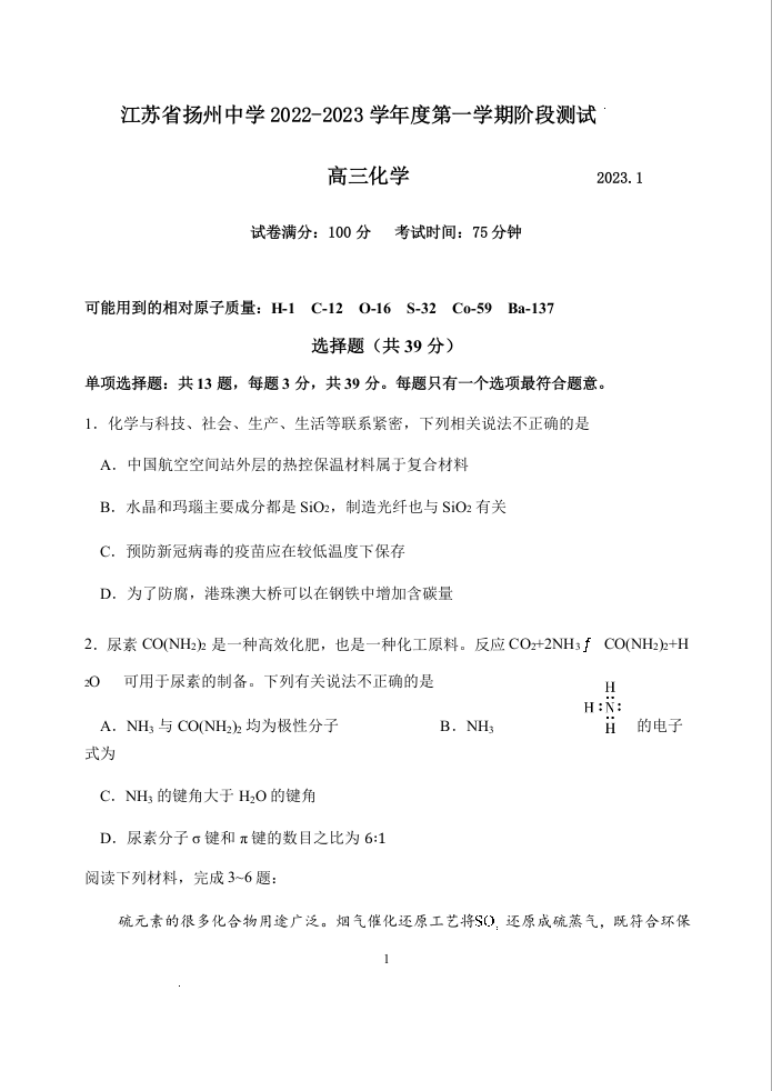 高三化学+答案--江苏省扬州中学2023高三上学期1月月考(期末)