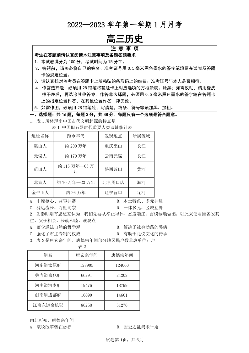 高三历史+答案--江苏省扬州中学2023高三上学期1月月考(期末)