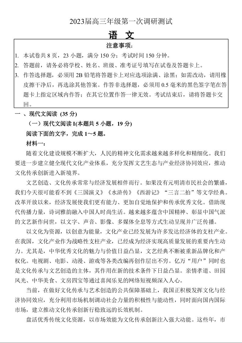 高三语文+答案--江苏省苏北四市2022-2023学年高三第一次调研测试